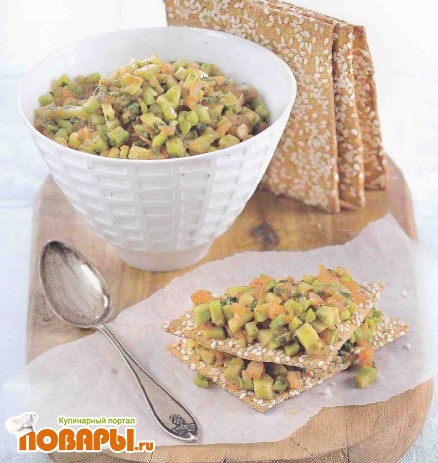 На помидоре сделайте крестообразный надрез, окуните помидор в кипяток, затем обдайте холодной водой. Снимите кожицу, разрежьте помидор и удалите жидкость с семенами. Мякоть нашинкуйте маленькими кубиками. Нарежьте мякоть авокадо такими же маленькими кубиками, как помидор.