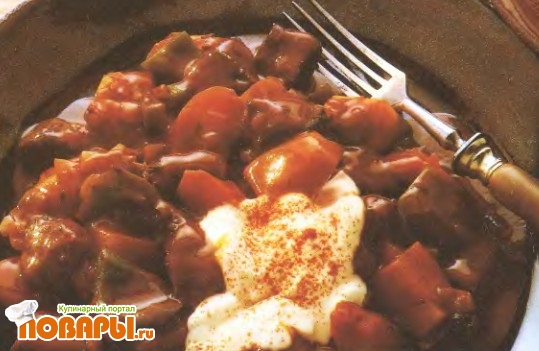 Мы приводим здесь один из рецептов венгерского гуляша - великолепного, ароматного, сытного мясного рагу. Один из основных его ингредиентов - молотая паприка, которая готовится из разных видов сладкого красного перца. Этот гуляш с вином, приправленный семенами тмина и пряной паприкой, украшает белая сметана, ярко выделяющаяся на красном фоне.