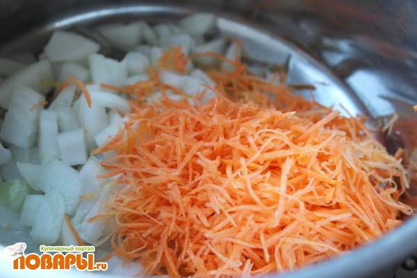 Очищаем овощи и нарезаем: лук кубиками или полукольцами, морковь кубиками, кольцами, полукольцами или шинкуем/натераем на терке.