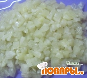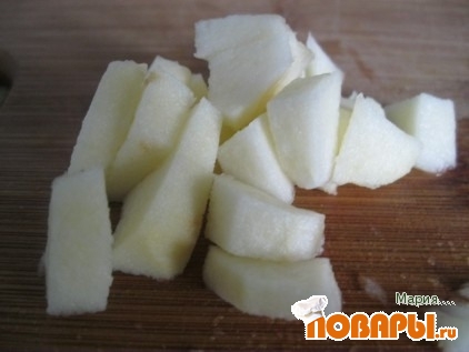 и яблоко очистить и нарезать на небольшие кубики, соединить и посыпать сахаром, дать немного постоять.