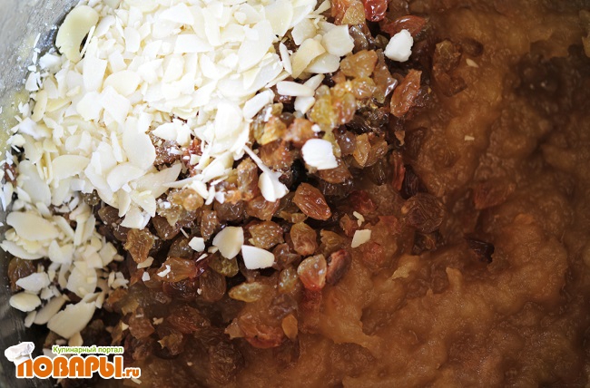 Добавляем миндаль и изюм к яблокам. Варим минут 30 под закрытой крышкой, на маленьком огне.