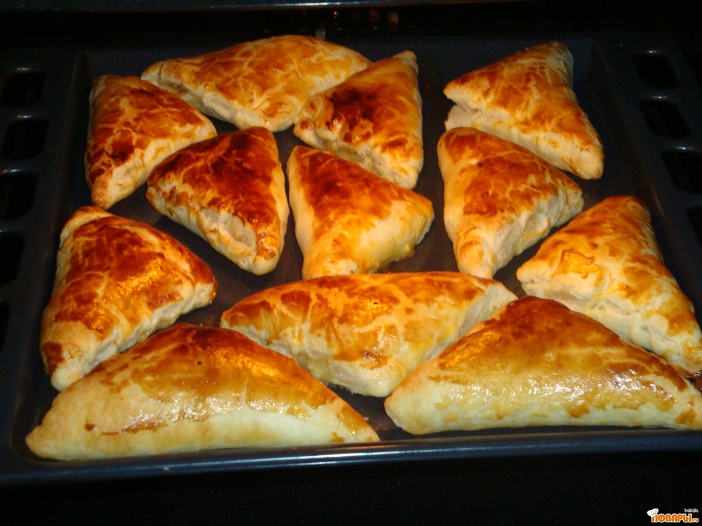 Квадраты сложить в треугольники, края прижать. В желток добавить 1 чай. ложку воды, размешать, смазать все треугольники и выпекать 12-15 мин. при температуре +180.
