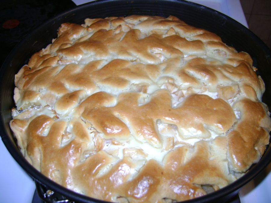 Из остатков теста сделать "косички", выложить их на пирог. Смешать сметану с сахаром и залить эти кремом пирог. Все. Ставим в духовку примерно на 180 градусов мин. на 30-40. и наслаждаемся