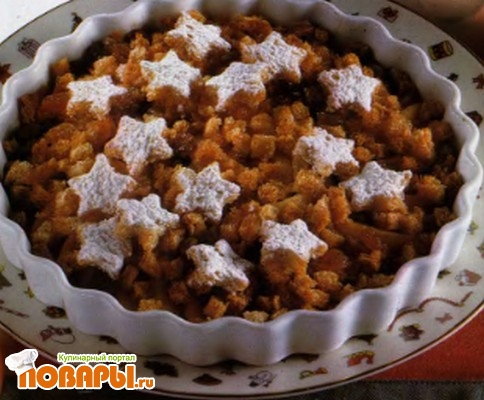 При помощи формочки вырежьте из ломтиков хлеба звездоч¬ки, окуните в растопленный маргарин и выложите на фрукты Запекайте в духовке в течение 30 минут.