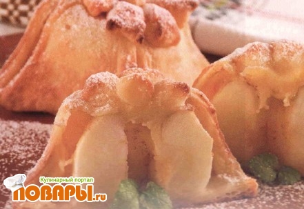 Соедините противоположные концы квадратов, смажьте их взбитым яйцом и запеките яблоки в тесте при 230 °С. Перед подачей охладите и посыпьте сахарной пудрой.