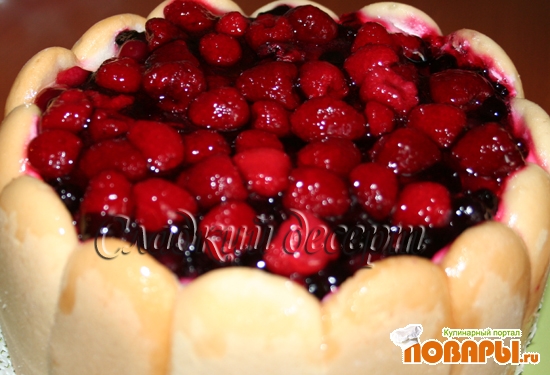 Испечь из этой массы 3 коржа. Коржи промазать взбитыми сливками (или вашим любимым кремом). Из готовых бисквитных печенюшек закрыть боковины торта, поверх торта выложить любые ягоды и залить желе.