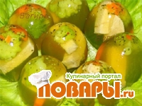 Через некоторое время на бульоне появится шапка, которую надо снять. Затем процедить бульон через двойной слой марли. Но вернемся к нашим яйцам. Когда немного бульона в скорлупках застыло, в каждую скорлупку положить тертую вареную морковь, нарезанные тонкими брусочками мясо или рыбу, зелень; зерна граната(!), консервированный горошек, кукурузу,