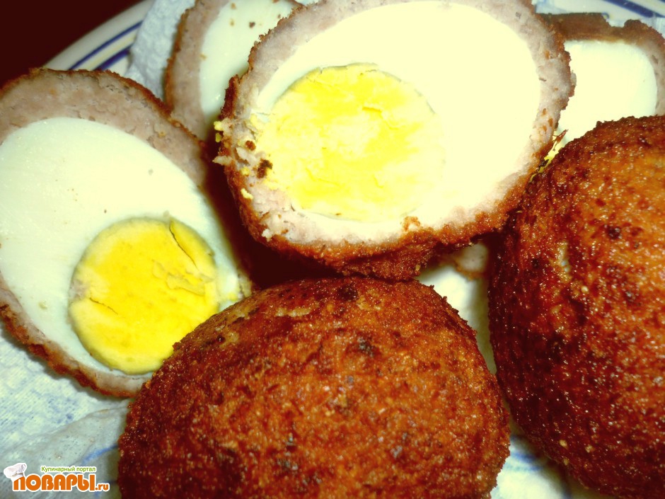 Яйца очистить от скорлупы, из колобка фарша сделать лепешечку и облепить яйцо равномерно со всех сторон. Обвалять в муке, окунуть в яичный льезон и запанировать в сухарях.