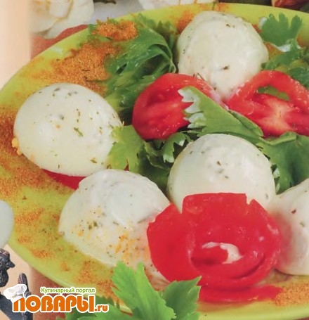 Яйца разрезать вдоль на две половинки, уложить на тарелку срезом вниз и полить каждую половинку 1 ч. ложкой майонеза.