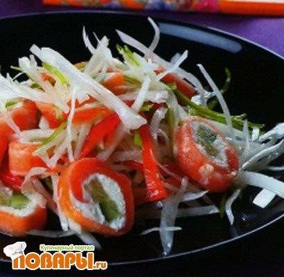 Соединить перец, дайкон и огурцы, добавить кусочки роллов, заправить оливковым маслом, смешанным с соевым соусом.
