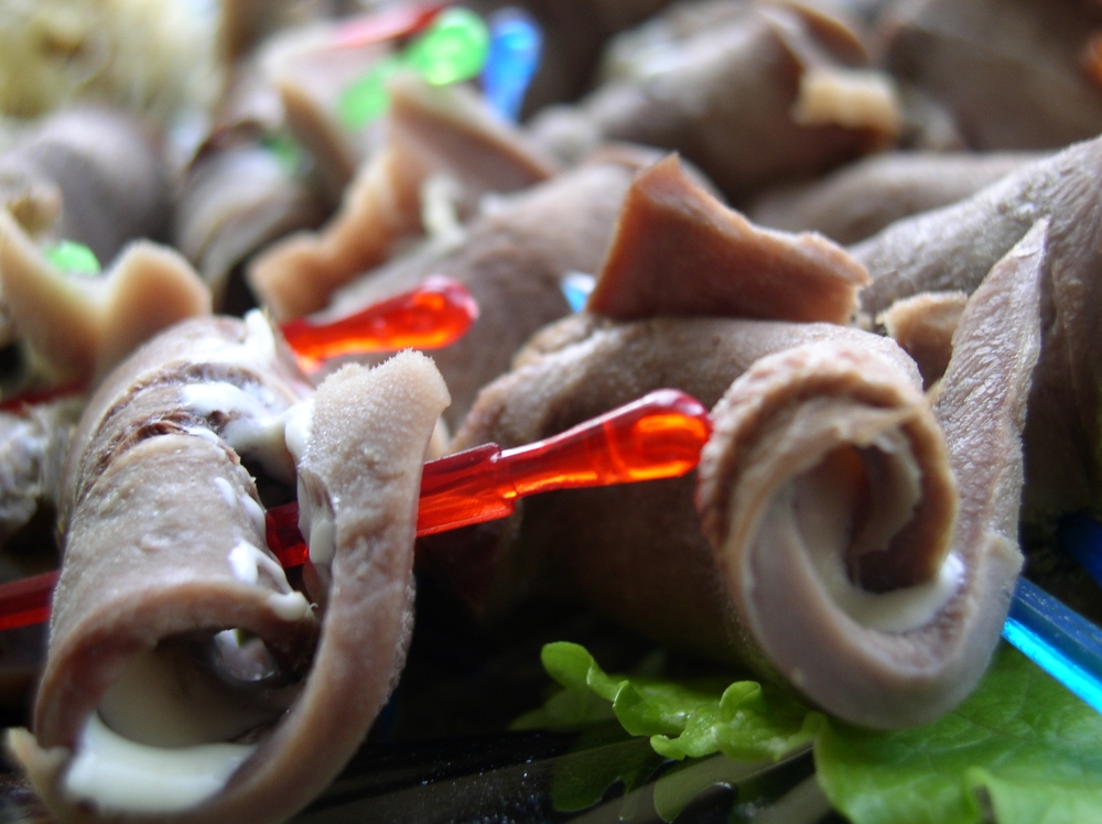 Язык отварить в соленой воде (где-то 2-2,5 часа) нарезать тонкими кружочками, намазать крем-чизом, посыпать давленным чесночком, свернуть рулетиком и заколоть шпажкой. Закуска объедение.