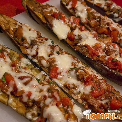 Берем получившиеся баклажановые чашечки и ложечкой выкладываем получившуюся смесь. Посыпаем сверху моцареллой и отправляем в духовку на 5-10 минут!