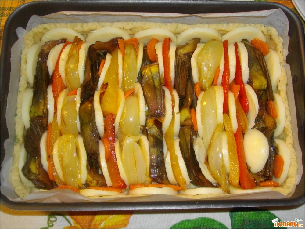 1 луковица, 1 морковь, по половине красного и желтого сладких перца, 3 артишока, масло оливковое, 250г. сыра «Гальбанино» (это белый полутвердый сыр с нежным сливочным вкусом), 2 ст.л. тертого пармезана. Для теста: 2 яйца, 100 г. маргарина, половина стакана рубленого сельдерея (хоть стебли, хоть листики или петрушки), соль, перец душистый, мука (сколько возьмет тесто).