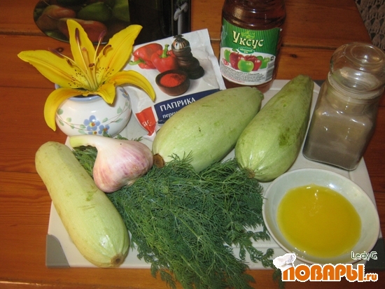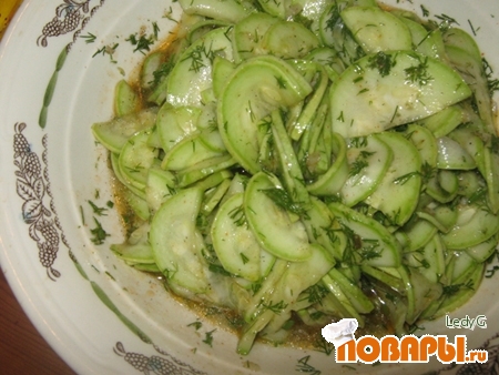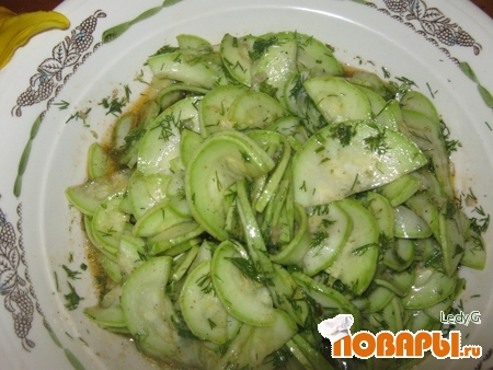 Молодые кабачки нашинковать тонкими полукольцами, посыпать солью, перемешать и оставить на 30 минут. Пока кабачки просаливаются приготовим заливку. Чеснок выдавливаем через пресс, добавляем масло, уксус, мед, перец, зелень, перемешиваем.