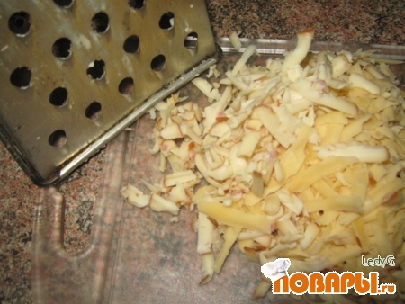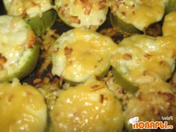 На крупной терке трем сыр, можно потереть колбасный сыр, тогда у готового блюда будет пикантный копченый вкус. Посыпать кабачки тертым сыром и запекать в духовке до золотистого цвета.