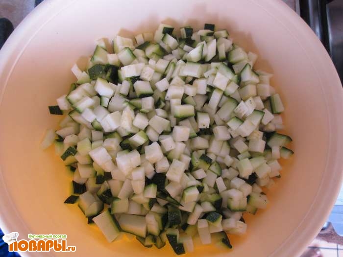 Морковку натираем на средней терке, лук мелко нарезаем, а кабачки тоже нарезаем, но небольшими квадратиками.