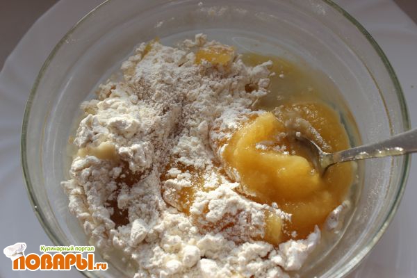 Смешиваем муку, соль, соду. Добавляем к ним кабачковое варенье и растительное масло, вымешиваем.