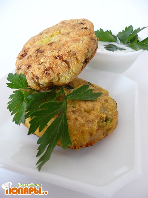 Из фарша сформировать овальные котлеты, обвалять в кукурузной муке, затем во взбитом яйце и снова в муке.