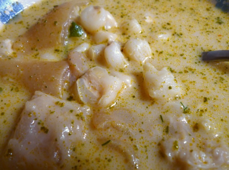 Для Пикадильо отдельно меленько нарезать зеленый лук или порей, петрушку и кинзу(можно только петрушку, но ни в коем случае не укроп!), сложить в вазочку, поставить на стол. В глубокие тарелки наливать бульон с кусочками ножек, добавить черпачек отцеженной кукурузы и подавать. Каждый за столом положит себе в тарелку пикадильо по вкусу.
