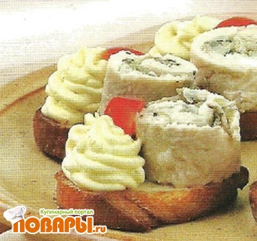 Перед подачей обжарьте ломтики хлеба на оставшемся масле, положите на один край каждого рыбный рулетик, а на другой выдавите через кондитерский шприц розетку из сливок, взбитых с приправой карри. Оформите розетку кусочком помидора.