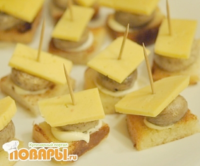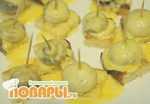 Сыр порезать дольками, в таком же количестве сколько грибочков и тостов.