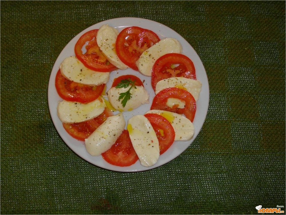Моццарелла - мягкий волокнистый итальянский сыр из молока буйволиц. Лучший сыр для итальянской пиццы. Сыр продается в сыворотке или рассоле и храниться долго он не может. В значительно меньших количествах производится копченная Моццарелла, которая может храниться гораздо дольше. Моццарелла белого цвета с чуть кисловатым вкусом и запахом молока. Во многих странах производятся сыры аналогичные Моццарелле, но из коровьего молока. В России вместо моцареллы прекрасно идет нежный адыгейский несоленый сыр. Если вы поливаете этот салат душистым подсолнечным маслом, то бросьте сверху горсточку жареных чищеных семечек. Это подчеркнет вкус и добавит изюминку вашему блюду.