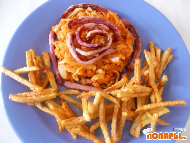 Добавляем бекон к капусте. К тушеной капусте с беконом я еще пожарила картошку фри.