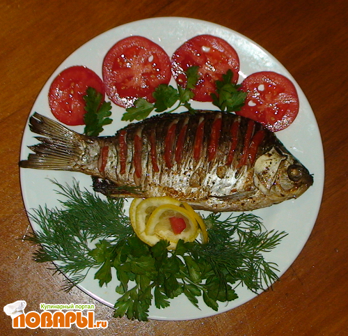 Вложить внутрь и в надрезы рыбы нарезанные дольками свежие помидоры.