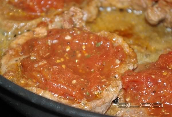 Мясо обжарить с одной стороны, перевернуть, выложить на кусочки помидоры, оставшиеся от маринада.