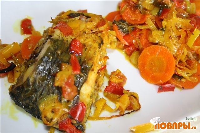 Половину готовых овощей выкладываю в форму, сверху выкладываю чуть присоленную рыбу Закрываю сверху оставшимися овощами