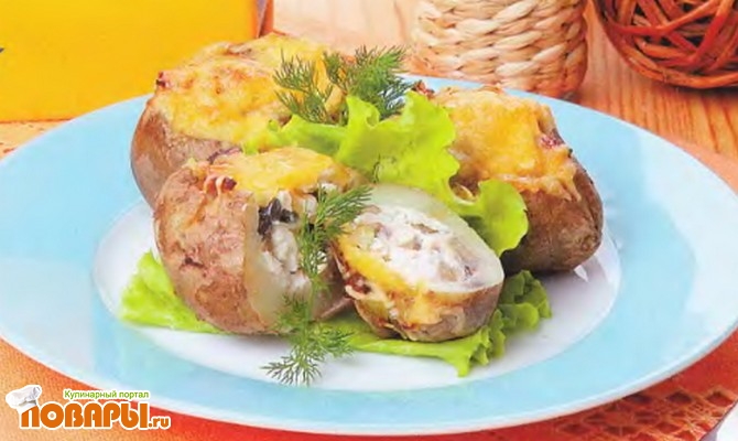 Все хорошо перемешать. Полученным фаршем наполнить картофель и уложить в глубокую сковороду, смазанную жиром, залить сметаной и запечь в духовке до готовности.