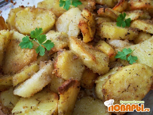 Слить воду. Выложить картофель в форму для духовки, устилив её бумагой или фольгой предварительно. Посолить, хорошо полить оливковым маслом и затем как следует посыпать сухарями, смешанными с порезанными ароматными травами, переворачивая его, чтобы он полностью был покрыт. Оставить картофель на пару часов, накрыв полотенцем.