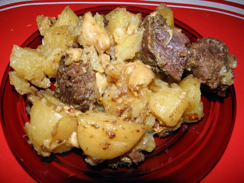 - В рецепте конечно пишут что картофеля столько же сколько мяса. Опять же, корректируем. Если на праздник, то выдерживаю четкую пропорцию. Если в будни, то облезут, много мяса жрать вредно.)) На полкило мяса где-то кило картошки. Тоже замечательно.
