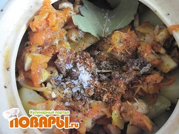 В горшочек сложить мясо, картофель и грибы с луком и морковью. Добавить душистый перец, лавровый лист, базилик и кориандр. Посолить и поперчить. Добавить немного воды.