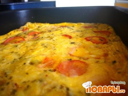Разложить на противне нижним слоем картофель, залить сверху яйцами. поставить в хорошо разогретую духовку и ждать, когда верх поднимется и покроется корочкой.