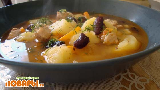 Тушить до полу готовности картофеля, затем промыть фасоль из банки, и закинуть в кастрюлю с картофелем и мясом.