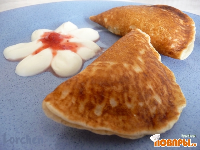После начинить блинчики творожным сыром ( у меня был с зеленью), залепить в виде вареника.