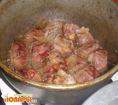 Мясо положить в казан и обжаривать на большом огне, а затем так же выложить. Обжарить в казане лук, добавить к нему мясо и немного воды. Накрыть крышкой и томить на слабом огне 30 минут.