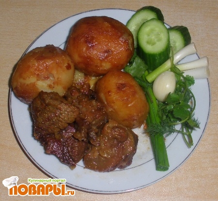 После выложить картофель на мясо и томить под крышкой ещё 20 минут.