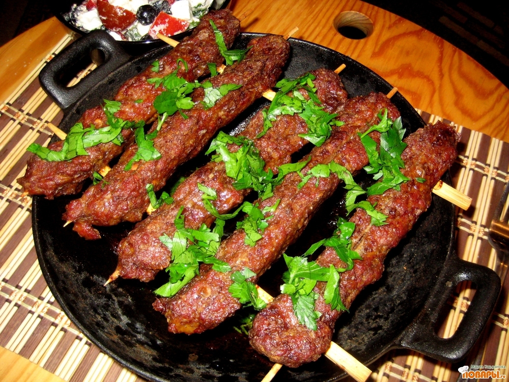 Растопите 2 столовые ложки сливочного масла, смешайте его с приправами и чили, достаньте кебабы из духовки и промажте кисточкой, смоченой в масле со специями. Эту процедуру повторите 2-3 раза за время приготовления кебабов (20 минут)