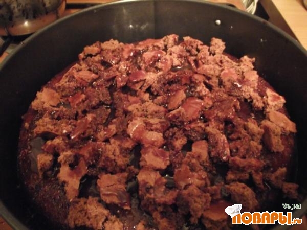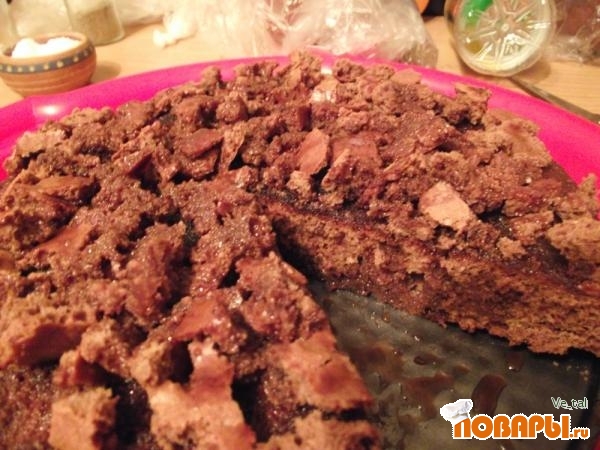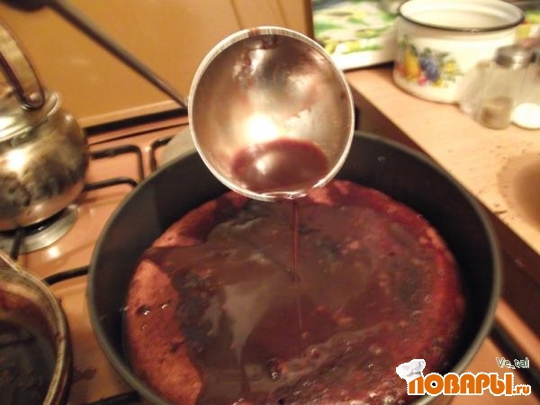 Теперь при помощи половника заливайте кекс шоколадным соусом, после срезанную верхушку с кекса раскрошите над кексом и залейте оставшимся шоколадным соусом.