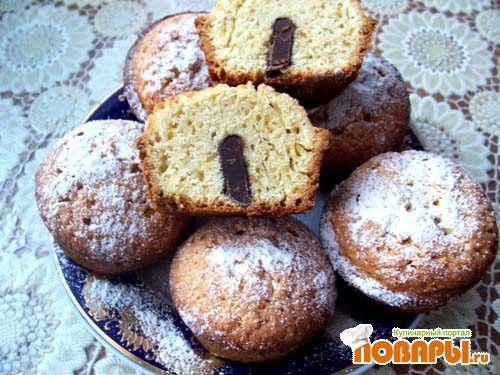 Взбить яйца с сахаром, добавить мягкий маргарин и сметану. Все тщательно взбить, добавить муку, разрыхлитель и ваниль. Все хорошо перемешать. Формочки для кексов наполнить на 2/3 объема тестом, в каждую формочку вставить по маленькому кусочку шоколада. Выпекать при температуре 180 градусов.