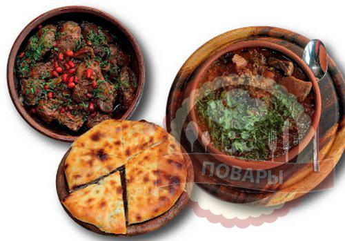 Затем всыпать муку (пшеничную или кукурузную), через 5 мин влить бульон. Варить 10—15 мин, затем положить сваренные и протертые через сито ткемали или помидоры, дать закипеть и заправить разведенными в бульоне толчеными грецкими орехами, чесноком, хмели-сунели, зеленью кинзы, лавровым листом, солью.