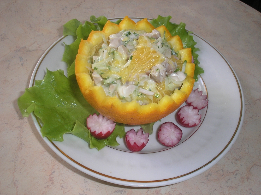 Смешать филе, апельсины, огурцы. Посолить по вкусу. Заправить майонезом. Выложить салат в половинки апельсинов. Украсить.