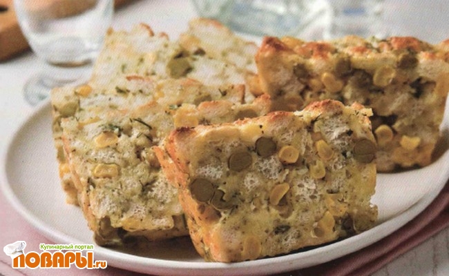 Из батона выберите мякиш, смешайте его с яйцами, майонезом, измельченным чесноком, тертым сыром, горошком, кукурузой и зеленью, посолите.