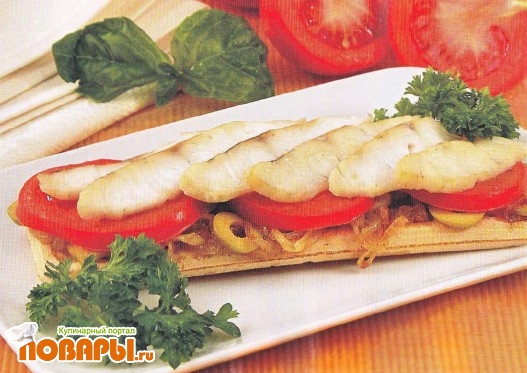 Лук нарежьте тонкими кольцами, обжарьте на масле до золотистого цвета, охладите. Добавьте мелко нарезанные оливки и уложите приготовленную массу на хлебцы. Сверху уложите помидоры, нарезанные кружочками.
