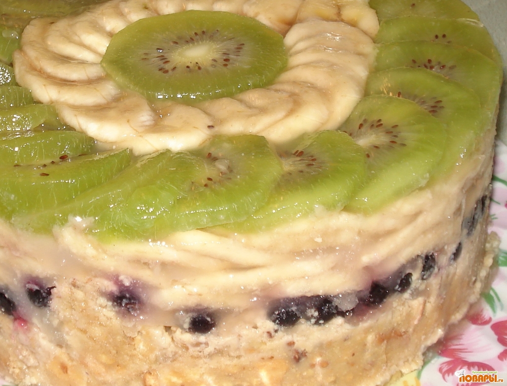 На дно формы выложить слоями фрукты, чередуя их. "Тесто" из печенья выложить сверху фруктов, сделать дырочки до дна, залить набухшим желатином. Торт поставить в холодильник до застывания желатина.