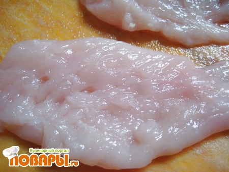 Куриную грудку помыть и хорошо просушить полотенцем, порезать на порционные кусочки и слегка отбить.