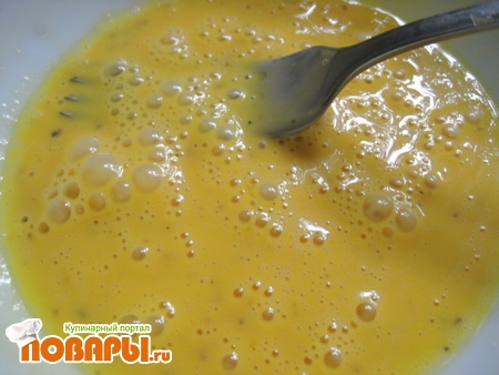 Сделать кляр: взбить яйца с солью и перцем. Я еще немного добавляю в него майонеза для пышности (можно пару ложек пива).