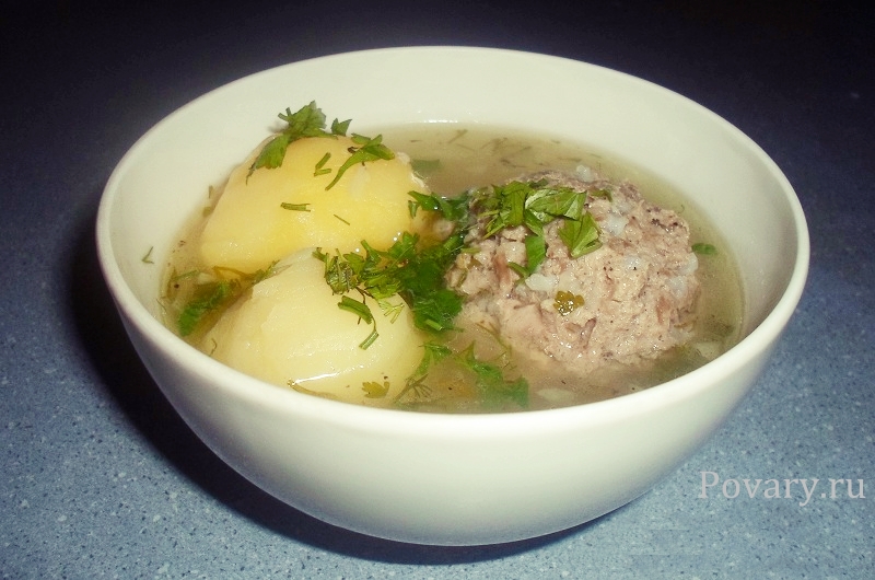 Затем в кастрюлю закладываем мясные шарики и варим до готовности риса. Оставшийся лук обжариваем на масле до золотистого цвета и добавляем в суп. Берем зелень, любую, чем больше тем ароматней и вкуснее будет наша кёфта и добавляем ее в конце варки. Раскладываем по тарелкам порционно 1-2 шарика и 1-2 картошки и заливаем бульоном.